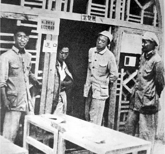 力群、焦心河、古元、江丰(右一)在“陕甘宁边区美展”会场门口合影