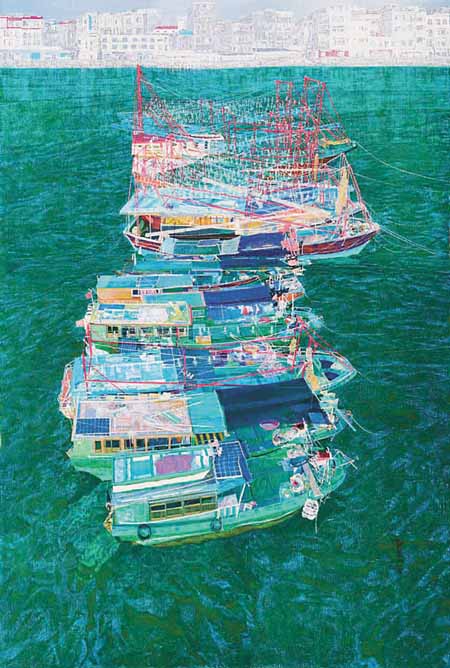 谢森作品中的阳光、流动的笔触和色彩,成为了他诗句的“词汇”,强烈的明暗对比和亚热带蓬勃的生命形态,充分表达了其自我生发的情愫,《穿越》画面的光色、阴阳转换,似在述说自然和人类的永恒关系,像一首无声的岁月吟唱,而《人间四月天》像南方田野间的山歌,嘹亮而清新。谢麟的作品使我们感受到了一种浓烈的中国传统写意意味,意象的图式充满东方的审美精神,《西海岸连心港》《青岛大珠山》使我们体会到他直抒胸臆的艺术追求。吕峰以强烈的色彩和“带血性”的笔触书写北回归线野性勃发的生命体验,他的《阳光下的高友侗寨》《黄姚龙爪榕》都体现了他独特的表现语言。柳风的《天上人间》《熵》是作者与大自然心灵的交流,他用敏感的视觉触摸景物,并以喃喃心语与之对话,作品的自然风景飘溢着人的情感温度。潘新权的《涨潮》《等待归船》等海滩系列作品,灿烂的阳光、明亮的色彩,表现了他对生活的情怀,这也是其对“城市自行车”景观的延伸。苏雪薇对海边风景和树林的描绘,有一种粗犷豪放的情愫表达,《游艇码头》《阳光下的雁山园》像极了她的故乡北部湾的性格。蒋文洁的作品,从城市风景“工业题材”到表现自然景观,依然秉持着她特有的诗意表达,这在《麻黄梁风景之七》《城市建筑之二》等作品中能够明显感受到。《街头巷尾一》《街头巷尾三》及系列作品,是罗连对城市中绿植产生的情愫及对生命赞美的吟诵,恬静且清新,她营造了一方心灵的净土,慰人心灵。