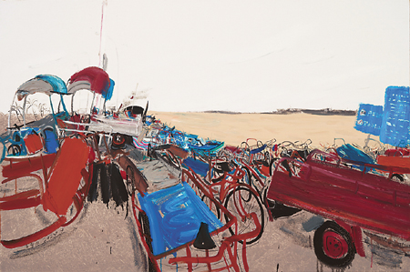 广西北回归线油画群体组成五年来,以鲜明的地域特征和艺术面貌在学术界引起关注,他们以当代视角和表现语汇,对现实主义油画的发展作出了有文化价值的探索,他们的作品对现实主义的当代性作出了新的注释。在风景油画的创作中,同样体现了他们的探索。首先他们对自然景观的观察角度产生了变化,他们更多是从自然景观去对应他们的精神世界,这种“观景”的方式,使他们更重视心灵的感受并塑造相应的审美境界,这种感受相对应的表现语言具有鲜明的艺术个性,在他们眼里,风景非风景,而是心境。于是,这种由客观现实引发的心灵“现实”表现,产生了与自然景观相异的精神图像——心灵感受的物化形态,因此,他们的作品给人们提供了一种新的视觉体验。