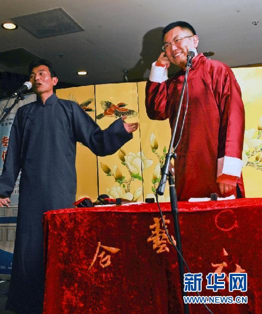 5月5日,在澳大利亚悉尼举行的“悉尼相声大会”上,悉尼“合艺社”相声演员朱炎龙(左)与赵竹毅表演相声。当天,由悉尼“合艺社”组织的“悉尼相声大会”举行,该社的部分演员表演了《铃铛谱》、《学外语》等相声段子。