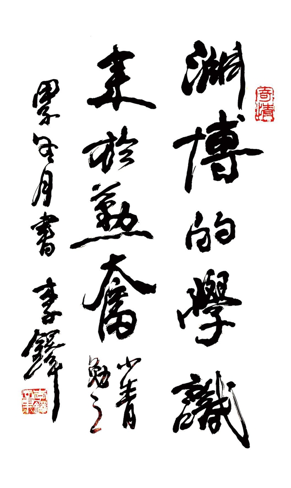 父亲坚持把对党和军队的忠诚融入创作,用书法作品宣传党的意志主张,服务国防和军队建设,助推强军兴军事业,体现出一名军队文艺工作者的使命担当。他专心书艺,书体正大雄秀,其笔健力透纸背;集千思于笔端,凝万绪于毫尖,秉古拙于沉雄,寓苍劲而挺拔。以其挥洒豪气、滞浊古气、雍容大度、舒展流畅,而独出一格。父亲热心公益,经常为社会捐款、捐物、救灾、济困。以父亲名义设立的500万元奖学助学基金,让一批批品学兼优的学子在他的资助下好学上进、茁壮成长。父亲一直不忘初心,在报答、感恩、奉献、回馈之路上努力前行。以他德艺双馨的崇高之举充分体现出一名军旅书法大家的大爱情怀。