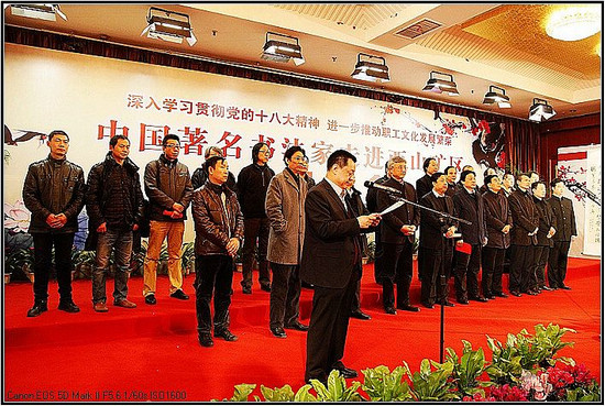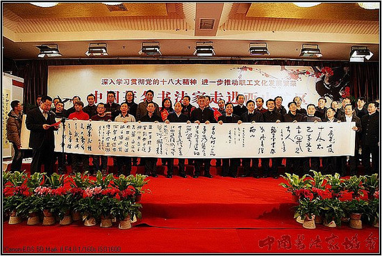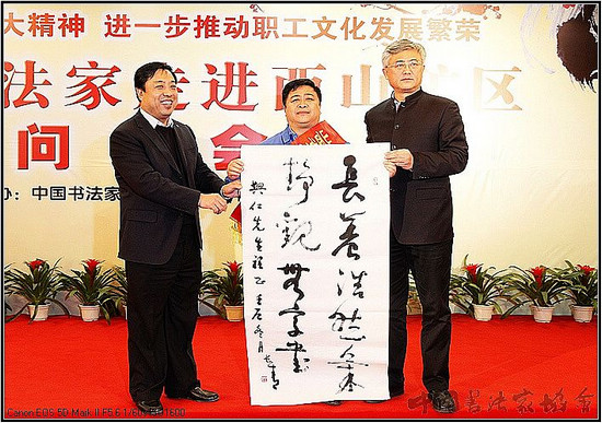 中国书协分党组书记、驻会副主席赵长青发表讲话:“中国书法进万家”活动自2005年启动以来,全国数千名书法家进工厂、下农村、走军营,密切了广大书法家和群众的关系,充分发挥书法家和广大书法工作者在构建和谐社会中的积极作用。此次活动来到西山煤电集团,就是要以书法艺术的形式,将党和政府的问候带到西山煤电集团,带给工作在一线煤炭企业的工人们,为丰富职工群众的文化生活贡献力量。