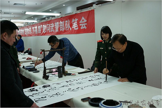 赵学敏、王长河分别代表中国书协及武警总部互赠礼物。座谈会结束后,慰问团一行参观了武警部队文化浮雕墙,观看了武警通信总站基层官兵自编自演的精彩文艺演出。之后诸位书法家来到武警总部机关文化活动中心创作室,用精心创作的书法作品表达对武警部队官兵的关心厚爱,对武警部队文化建设的重视支持。“警民一家亲”、“我武维扬”等80余幅书法精品,既凝聚着对人民子弟兵的深情厚谊,又展现了诸位书法名家的文化底蕴和深厚功力,令到场的武警官兵钦佩不已、爱不释手,纷纷要求与书法家及其精彩作品合影留念,充分享受着这场内涵丰富、精彩纷呈的文化盛宴。