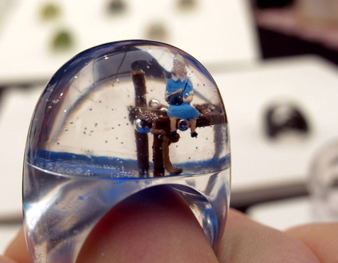 每一枚戒指都会有一段动人的故事,或热烈或恬静、或苦涩或甜美,总之拥有它的人一定会知道其中的滋味。香港设计师用几米漫画讲故事的方式将微观场景置于小小的戒指当中,让人很容易被这些被缩放了的浪漫景色勾起对往日美好时光的回忆。每枚戒指里的故事都有着不同的主题,从童真童趣到雪地里的修女,从远行的妇女到乡村的生活……戒指里面的世界如同童话般一样令人向往,如果能够选一枚送给心爱的人珍藏那就再好不过了。