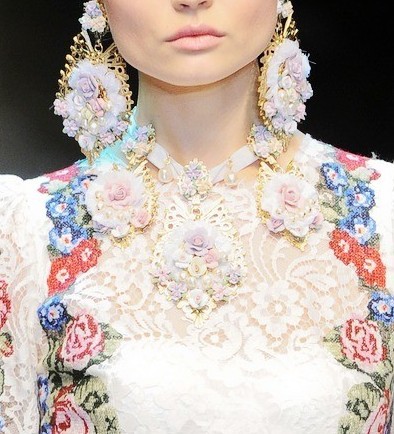 繁复的印花,宫廷感十足的剪裁,大量的珠宝配饰,DOLCE&GABBANA 2012秋冬秀场用惊艳来形容绝对不为过。这一季模特所佩戴的发饰、耳环、项链以及手链都极具有巴洛克风情,虽然繁复,但美得窒息。闪亮的吊坠长耳环&皇冠头饰摇曳生姿,仿佛一位位从画中走出的女子。