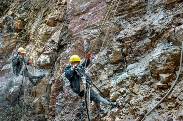 2018年11月2日在开发湖南湘西十八洞村旅游业的同时,修路工人排除道路两边的崩塌滑坡泥石流等险情。
