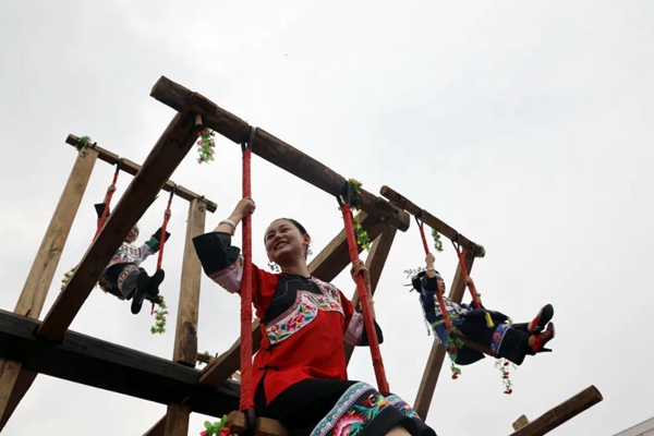 2019年8月8日苗族的古老节日赶秋节,十八洞村的姑娘们坐在八人秋千上欢庆丰收。宋刚明 摄