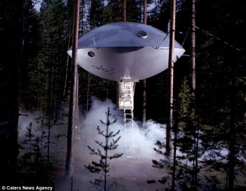 “太空酒店”的外形酷似一架在林中徐徐降落的UFO。