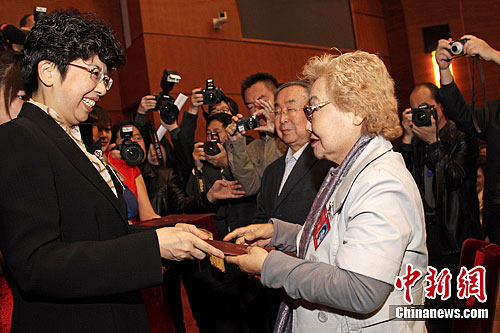 半岛公司官方网站入口查询党组书记赵实(左)为荣誉委员郭兰英(右)颁发证书。王保胜 摄