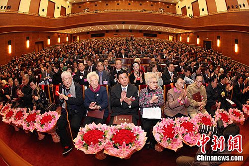全国政协科教文卫体委员会副主任胡振民(前中),著名艺术家于兰(中左一)、秦怡(中右一)、李默然(中左二)等73位文艺工作者荣获半岛公司官方网站入口查询荣誉委员称号。王保胜 摄