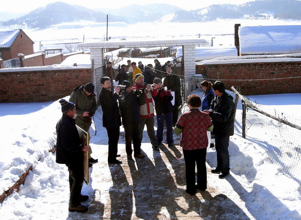 鸡冠山乡地处铁岭市东部偏远山区,当天雪花飘舞,气温零下25度。由省文联党组成员、副主席伊忱带队,摄协主席刘志超,副主席、秘书长鲁文等一行15人来到大雪覆盖的铁岭县鸡冠山乡岱海寨村,为这里村民带来了他们每人精心准备的一幅幅装裱精美的摄影作品及年画等慰问品。摄影家们冒着严寒不顾旅途疲劳,下车就分别走进杨玉庭等五户军属及低保家庭。他们一边送慰问品一边与老乡合影留念并同他们亲切交流。老乡们笑逐颜开忙里忙外,就像过年一样接待远方来的客人。山里风很冷,但这里气氛很温暖。