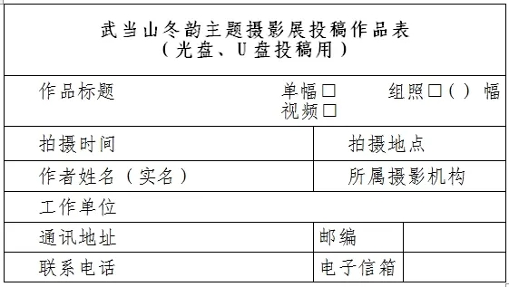 投稿作品以光盘(CD-R或DVD-R)、U盘存储形式邮寄至:北京市东城区东四十二条48号 中国摄影报社活动项目部“武当山冬韵主题摄影展”办公室收(100007)