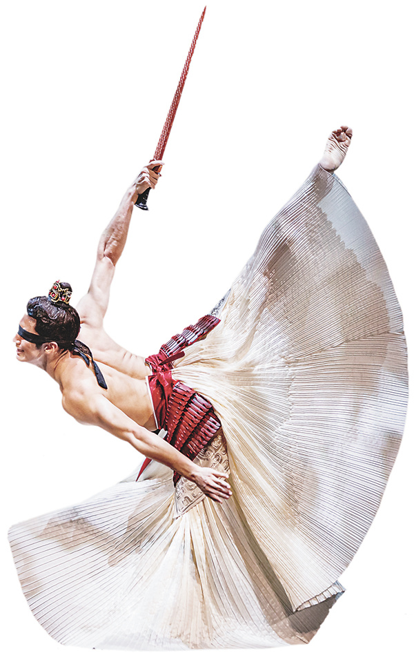 催战的鼓声一阵紧似一阵地擂响……若明若暗的舞台上空,是竹简状摊开的环形装置,装置上明灭隐现的“简书”以及环形装置内悬挂的一扇巨大编钟,把我们带入“春秋无义战”那段久远的历史中……主创阵营在环形装置迷离的“简书”中映现:总编导王舸,编剧许锐,作曲杨帆,舞美设计秦立运,灯光设计任冬生,服装设计崔晓东,人物造型设计孙晓红,多媒体设计王新磊,声音设计刘奕,以及编舞柳雯、林晖莛和张璨。随后出现了3位“领衔主演”的人物造型,分别是国君和成、乐伎希音与大将戈启;接着是5位“主演”的人物造型,分别是凤鸟、公主乐安、乐国来使、先王和未与少年和成。后来的叙事展开告诉我们,舞剧的冲突主要是人物性格的冲突,这个冲突聚焦于3位“领衔主演”,而且格外聚焦于国君和成的内心冲突。或许正是把这一“内心冲突”作为舞剧冲突的主导方面,剧中的其他5位“主演”(包括和成的妻子乐安以及象征灵界乐安的凤鸟)基本上是国君和成“内心视象”的外化。这使舞剧叙事呈现为一种极其复杂的事象——对往事的追忆往往成为当下焦灼的思虑;对当下的感受又往往用碎片的记忆来表达;加上主创用“凤鸟”这种灵界乐安的形象来表现和成觉知的“天启”,以及借助少年和成与当下和成的“二重身”来表现和成性格的成长……乍看时会觉得这种复杂的舞蹈叙事比较“烧脑”,跟进后发现其实是舞剧首席国君和成的难以抉择“揪心”……倏忽间,环形装置上投放出人喊马嘶、刀光剑影的古战场影像,影像上叠映的字幕写道:“传说中古老的和国与乐国,地处中原之南……和国征战四方,日渐强盛。乐国遣公主乐安远嫁和国,以求免于战火。国君和成与公主乐安琴瑟相和,铸钟兴乐,止戈休战……然而,宫中突遭离奇敌袭,引发大火。公主乐安被刺殒命,国君和成双眼被灼伤……”这段文字在场刊上被称为“前情提要”,与之相伴的表演作为“序幕”其实是正剧的“前情”,它也是剧名《乐和长歌》的“题解”。