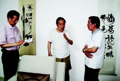 七月的北京,天气炎热,贺敬之老人身穿灰黄色的短裤和白色的汗衫,在北京木墀地的新居客厅里亲切地会见并与我们攀谈。周明和贺老及夫人柯岩是至朋好友。去年12月11日,著名作家、诗人和报告文学作家柯岩去世后,周明曾写一篇题为《你和我们永不分离》回忆柯岩的长文发表在《北京日报》上,贺敬之读后很受感动,特邀周明来家回忆与柯岩一同采访的往事。贺敬之与周明交谈之后,我们把一本《中华视点》的画报赠送给贺老,画报中有一张30年前贺敬之与习仲勋、王震等领导同志一起观看西安易俗社赴京汇报演出后与剧组全体人员合影的照片(贺敬之时任中宣部副部长)。贺老仔细地看了照片后说,“我记起来了,有这么回事。陕西和延安我是有感情的,秦腔晋京演出,我是要去看的。”他又说:“我现在年纪大了,身体又不好,一般采访我都拒绝了,但陕西来的记者我不能拒绝呀!年前《西安晚报》有位女记者来访,我就破例接受了采访。”接着,贺敬之老人就围绕着延安及文坛的话题与我们侃侃而谈——
