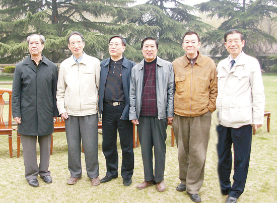 左起:陈忠实、阎纲、雷抒雁、周明、张同吾,二○○九年三月摄于西安。 阎纲供图