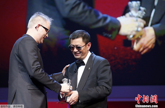 北京时间2012年2月17日凌晨(柏林当地时间2月16日晚),第63届柏林国际电影节闭幕式举行。罗马尼亚电影《孩童姿势》获最佳影片金熊奖,拉奇夫与帕琳娜亚分获帝后。图为王家卫上台为获奖者颁奖。