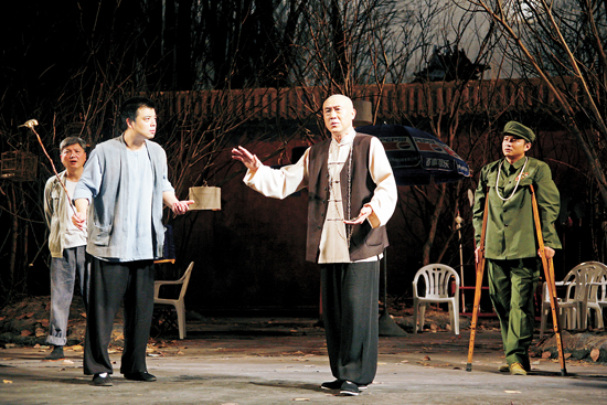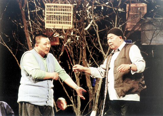 即使是对这些状态的把握,创作者也严格地将它们控制在含糊而琐碎的表层。大幕拉开,舞台上是老北京街心花园的一个熙熙攘攘的清晨。鸟声、人声、胡琴声、车铃声、叫卖吆喝声此起彼伏,早起的人群在稀疏萧瑟的几棵树木之间忙碌着。晨练的、遛早儿的、吊嗓子的、理发的、打扑克的、卖煎饼的……那些提着罩着蓝布的鸟笼子,或者把各式鸟笼挂在树枝上、凑在小公园灰白色的石桌石凳前高谈阔论的鸟人们,就夹杂在这个群体中。他们交流着喂鸟、遛鸟、训鸟的经验和体会,气度雍容高贵,神情散淡闲雅;他们谈论着鸟经、鸟语、鸟态,仿佛在谈论着自己的人生。曾经在京剧舞台上露头露脸的花脸演员三爷秉持着往日的辉煌,君临天下般俯视着鸟人世界。老想从三爷那里学几招“绝活”的京剧票友“天津卫”唯唯诺诺地跑前跑后,穿梭于京剧演唱和养鸟之间。火葬场退休的工人“百灵张”爱鸟成痴,时刻警惕着自己精心调养的好鸟,怕它学会了脏口……随意、无机、偶然,彼此间的交叉疏远而松散。不仅如此,黄毛、扭秧歌队伍、联防队员等的意外出现,简直就是节外生枝了。他们犹如不明飞行物般漂浮在剧中,间离着剧情,成为一种无法规范、无法纳入表述系统的存在,使作品显得更加混沌而荒诞。