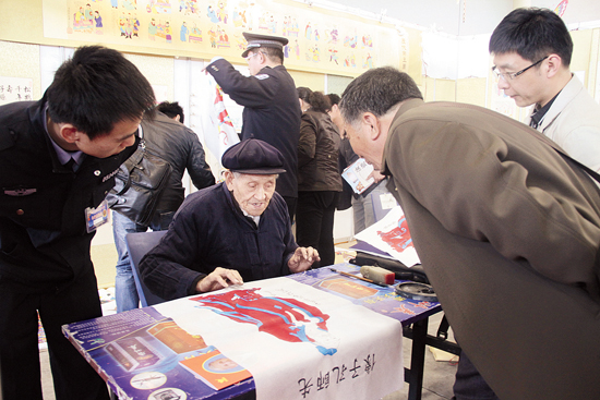 已经85岁高龄的潍坊民间艺术大师杨洛书不顾年事已高,专门来到展区现场。作为杨家埠木板年画同顺德画室的第19代传人,杨洛书荣获“中国民间文化杰出传承人”和联合国教科文组织授予的“民间美术大师”等称号。他的身边不一会儿就围满了观众,老人非常细心,认真地为大家讲解着杨家埠年画的历史和特点。很多观众说,来展区就是为了看杨洛书来的,他可是咱们潍坊国宝级的人物啊!