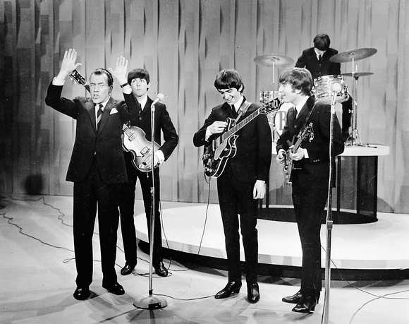 披头士站在美国百老汇的舞台上,从右至左分别是约翰·列侬、乔治·哈里森、保罗·麦卡特尼和百老汇主持人,后面为林戈·斯塔尔