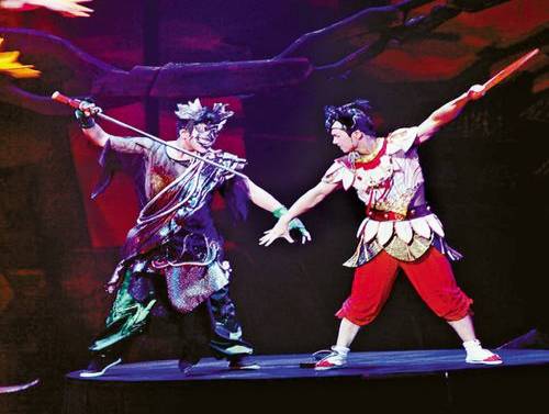 洁白的闪着亮光的小水母们灵巧地晃着绿色的碟子,纹丝不乱;彩色的“珍珠”翻飞,原来是小海蚌们在抖空竹;两米高的圆环套起,小虾米毫不犹豫地排队从中跳过……在这个海底世界里,每个小动物都身怀绝技。而脚踩风火轮的哪吒,更是英气勃勃,武艺非凡。9月5日晚上,天桥剧场里欢呼声四起,掌声连连,由北京演艺集团、中国杂技团有限公司推出的儿童杂技剧“东方神话”之《哪吒》,融杂技、戏剧、舞蹈、魔术、武术等于一体,给现场的小朋友和家长们营造出一个紧张欢乐而又玄幻的世界。