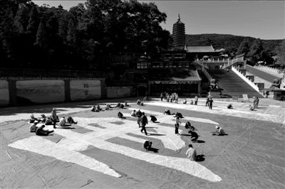 中国当代著名书法家、教授、研究员,年过古稀的张瑞龄先生,为庆祝第二届北京重阳文化节暨第二十五届北京八大处重阳游山的举办,挥毫泼墨,写下苍劲有力的两个大字“重阳”,以此来表达对全天下老人的祝福。八大处公园将其扩大了近百倍后,将两个黄色的“重阳”二字镶嵌在大红灯笼上,并制作成大型山体景观。预计这件艺术品将于下周悬挂在虎峰山顶。 京华时报 范继文摄影报道