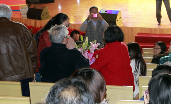 八路军老战士文工团向王定国老人献花