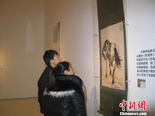 图为参观徐悲鸿笔下各种姿态的“马”
