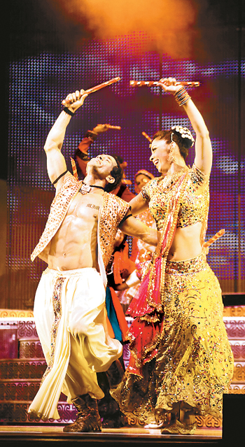 舞台上,熊熊燃烧的火焰、肃穆的石门和暗红色灯光中高耸的神秘湿婆神像一一展现,带有浓厚异域风情的音乐响起,观众们的注意力立刻被眼前的一切紧紧抓住。古老的拉贾斯坦邦,神像俯视着芸芸众生。舞者们身着长裙,欢快地飞速扭动腰胯,带来了最纯正的印度传统舞蹈——卡塔克舞。姑娘们随着鼓点舞起脚上的铃铛,清脆的铃声从轻柔的慢板渐渐过渡到暴风骤雨般密集。她们艳丽的裙摆和长长的头纱旋转打开,如同一朵朵盛放的花。敲击长鼓的小伙子此时也跟着转动起来,帽子上的红缨划出一道道美丽的弧线。迅疾的鼓点中,台下的观众几乎分辨不清节奏,却仍用掌声紧紧跟随着他们的跳动……《宝莱坞明星》凭借着最纯正的“印度风”,感染着现场的每一个人。