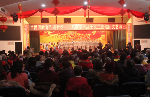 为大力弘扬爱国主义和延安精神,继承党的光荣传统,1月28日,八路军老战士文工团在北京市东城区和平里街道办事处举行了“爱国教育进社区”巡回文艺演出的首场演出。