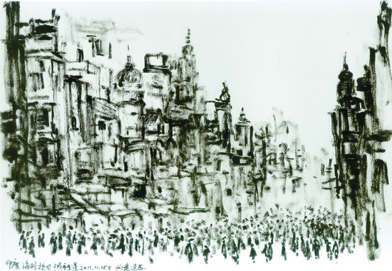 也许是导演的天性使然,每幅画李前宽都能给记者讲述出一个故事。“经常说艺术创作要‘三贴近’,贴近实际、贴近生活、贴近群众,说到底就是要善于感怀时代,感怀生活,这对于艺术家就像清泉和阳光。作为一个导演走到哪都是纸笔不离手,画就是我的旅行日记,画能让我产生形象的联想和感情的撞击。”作为一个七十多岁的老人,李前宽不光在艺术上充满激情,生活中一样充满激情,在接受记者采访的整个过程中都精神饱满。眼前的老人虽然是名导演,但在讲述故事的时候,更像是一名演员,时而激情澎湃,时而低头沉思,整个讲述过程绘声绘色,让记者不知不觉中,深深地被感染着。