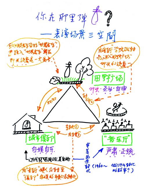 还有很重要的一点,我们每个音乐家都应该自问我在哪里演奏?我们音乐家最习惯的一个空间就是音乐厅,其实我们有很多室内民间器乐,比如古琴、琵琶,多在城市俱乐部、文人雅士聚集之地演奏,而民族管乐唢呐等多在广场。我们现在多是单一的音乐厅,其实对音乐本身来讲就带来极大的限制。我提倡表演场景的三个空间(参见本文插图),也是希望审美场景的转化,比如音乐厅是严肃正统的,以娱人为主,把观众作为上帝,老百姓喜欢什么我们演奏什么,去迎合,这一点始终是误导,老百姓也需要我们去引导,现在也不提这个了。的确进入音乐厅,更完整了,不粗糙了,往往自娱自乐的东西也没有了。而城市俱乐部,其实是反转为自娱自乐,我认为这点对民族民间音乐十分重要,我在1960年前演奏多是在这种城市俱乐部,非常自由。而到了田野和广场上,就是互动了,2010年我去日内瓦演出,在音乐厅下午的正式演出后,晚上我与当地的阿拉伯弹拨乐的乐师一起在广场上即兴表演,现场很疯狂啊。人的疯狂其实是人的本性,是艺术的自由状态,“即兴”自然而然就出来了。我认为,演奏中“即兴”是特别重要的状态,我也在培养学生这一点,东西全在谱子上,的确是规范的,但是离开谱子什么都抓不到,没有那种即兴、自由的乡土味道。