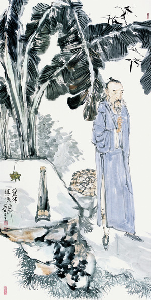 从王淼田“林泉高士”的写意作品来看,他又是“传统派”画家。他以固守文人画传统的创作,改变了传统文人画在写实主义思潮强烈冲击下不断萎缩和边缘化的趋势,使几乎断层的文人画的水墨人物传统得以延续,“融古今以生新意”,渗透出有强烈现代感受的“新文人画”的绘画特征。