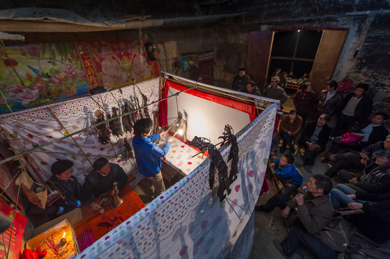 3月17日,巫山县骡坪镇观奇村村民在观看赵迎春(中)表演的皮影戏。