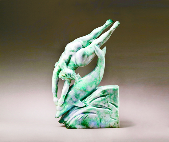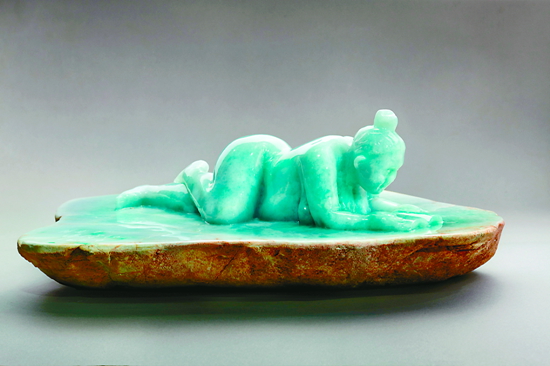 其四,材料拓展。2012年6月,许鸿飞在广州举行翡翠雕塑作品展,展示了30件以名贵翡翠材质制作的艺术品。他说,第一件翡翠雕塑很费劲,两个月才弄出来。而最后的效果则让许鸿飞大感意外——翡翠材质恰切还原了胖女人的珠圆玉润,丰乳肥臀充盈着温润的光泽,材质成了雕塑语言的一部分,他的风格特色获得进一步彰显。而在展出现场,许鸿飞更听取建议引入了“车模”理念,光艳照人的“艺术品模特”与《肥福》《肥二代》《四喜》等让人开心的“翡女人”一同展示。许鸿飞以“翡翠雕塑第一人”再度成为媒体热点,他不拘一格的艺术思维,也给人带来新的启示。