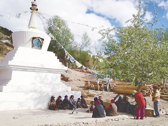 从甘孜州得荣县去往巴塘县的路上,一座白塔下坐着手持转经筒的老人