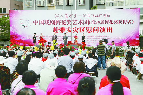刚刚在成都获得梅花奖的演员为雅安地震灾区群众送上了一台精彩纷呈的文艺演出