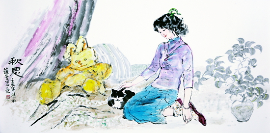 赵曼将她表现的主题定位在回归典雅优美、崇尚清新含蓄的审美标准上。所以,她以大胆的创新精神创作出艳而不俗的“新唯美”作品,《秋思》就是这样一幅佳作。右图中,抚猫少女的眼神似乎是怜爱地看着身边相伴的宠物,其实却流露出情窦初开的淡淡羞涩,含蓄的情意绵长悠远,对懵懂爱情的向往和对小动物的关切,使这幅作品充满了耐人回味的温馨色彩。画面中的少女甜美宁静,女孩子们特有的床品、玩具和粉色窗帘,被作者以水墨和宿色转化成纯正的中国画笔墨语言,充分发挥了宣纸与毛笔的特质,纵横恣肆的撞水、撞色和撞墨技巧,飘逸空灵的线条,都极富观赏价值。时装、发型、道具,这些现代社会的时尚气息在融入了大写意的国画后,焕发出新鲜的美感,使传统中国画的笔墨承载了网络时代的青春神采。
