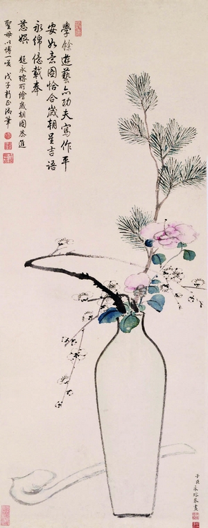 嘉庆皇帝的子、孙辈中,道光帝旻宁(1782—1850)是能作书法的,但谈不上什么个人风格和水准,咸丰帝奕詝(1831—1861)除了写字是能画几笔的,比如简单的花草禽鸟,虽然也有几幅钤盖了他的《画马图》,但更多作品并非是他亲笔,而是宫廷画师代劳的。咸丰帝喜爱的嫔妃叶赫那拉氏(1835—1908),亦即后来的慈禧太后,也曾经和咸丰一起画小幅的花鸟,在政变掌握实权后,则步其丈夫后尘,找来昆明的寡妇缪嘉惠、宫廷画师屈兆麟等人为她代笔,用以应付大量的赏赐需要。虽然那些代笔作品从娇艳的牡丹到挺拔的松树都是当时宫廷画师的最高水准,虽然这些赏赐得到了臣工们的百般阿谀,但它们的图式、技法已经坠入了清末绘画陈陈相因的没落怪圈,不但毫无创新能力,更谈不上有多高的艺术品位。这时的宫廷绘画艺术,处处体现出大清王朝日暮西山般的衰落。