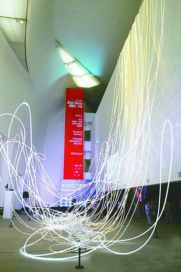 如果有机会在6月2日至22日期间走进中央美术学院美术馆大门,想必会一下子停住脚步:无数条内嵌LED灯泡的发亮软管从金属半球的源头延伸开来,一路铺展,错综复杂地交织、缠绕,最终如藤蔓一般从地面“爬”到顶端。面对它,独自欣赏已然足够精彩,因为从不同的角度看会有迥然各异的效果;结伴而来的人更玩儿得不亦乐乎,忍不住找各种有趣的位置相互拍照。