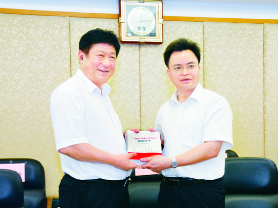 中国广东省委常委、广州市委书记万庆良(右)向市文联赠送《广州新型城市化发展政策读本》