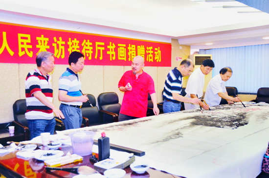 广州书画家创作向人民来访接待厅捐赠的作品(左起:任桂森、李晓白、朱颂民、黄健生、卢彦汛、卢德平)
