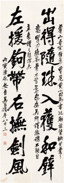 吴昌硕于1926年创作的行书纸本八言联完成后一年其就去世了,因此这件作品也毫无争议地成为其晚年最具代表性的书法力作,也成为后学对这位海派领袖的一种怀念。