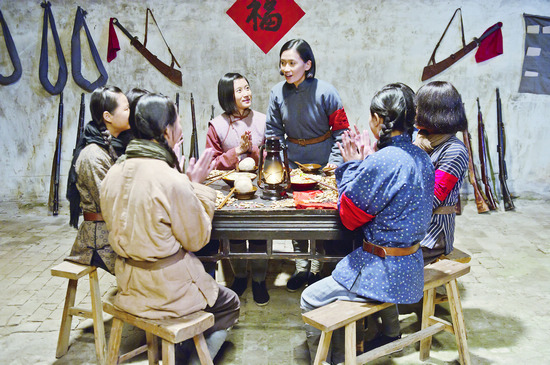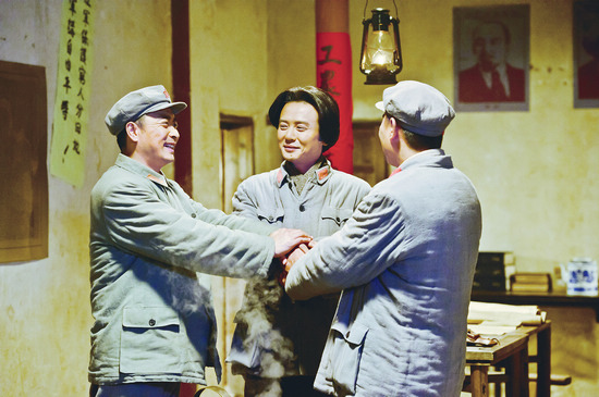 第二,是两个营垒。这两个营垒,你中有我,我你交叉,也很有意思。全剧有名有姓的人物竟然有三百多人,这是多么宏大?作家又如何把握住如此浩繁的人物呢?剧作集中呈现了毛泽东从小学教员到政治、军事战略家,成为“寻路”的主导;突出描绘了周恩来“顾全大局、相忍为党”的品质,成为“寻路”的保障;重点渲染了朱德从旧式军阀到红军统帅,成为“寻路”的支柱。看罢全剧,三位主要人物的形象得以铭刻于观者的内心。而作为对立面的蒋介石,同样以复杂的内心表现出独裁者的强势和无奈。此外联合主演的八人,内中有几名女角还是挺出彩的,如贺子珍是那样有情有义的性格。几个女角在这部戏里妥帖的分布,一下就把戏剧调剂得刚柔相济,阴阳结合。