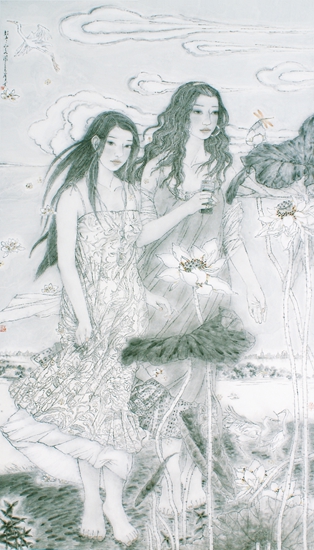 奋英画面的主体是清一色的长发、长裙、裸肩玉臂的妙龄女子,相伴莲蓬荷叶、白鹭树林、江流渔舟与风轻云淡,个个含蓄幽静、深情妩媚。她们手持音乐播放器、手机或电脑等现代电子设备,给人的感觉却好像是《诗经》中的美人——“蒹葭苍苍,白露为霜,所谓伊人,在水一方”。这也使我们再次看到了奋英所选择“水痕描”的魅力所在:这些清奇美丽的女主人公,告别了周昉、张萱类的绮罗人物的闲愁,也有别于今日消费时代顺流而下的时尚女子的平面、浅薄与轻狂。