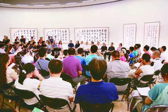 “怎样看待当代书法的创作追求”、“欣赏当代书法应从哪里入手”、“人人都写汉字,学习书法的门槛高不高,有着怎样的学养要求”、“针对目前网络时代键盘代替书写的现状,学习研究书法的意义何在”、“与繁体字相比,简体字在书法创作中也能达成审美共识吗”、“如何书写出既能继承古意又有时代精神的笔墨”、“有些作品风格摒弃雅致,多为狂放,是否有着功利目的”、“现在有多少学校开设了书法课程,学生毕业后都在做什么”……一系列涉及书法领域方方面面的话题,在艺术沙龙中互相碰撞。大家围坐一圈,畅所欲言,你一言,我一语,对书法的传承创新、教育体系乃至市场走势、就业形势侃侃而谈,甚至会有争执,却处处充盈着真诚。这样的开幕活动,没有了嘉宾致辞,没有了大红花剪彩,也没有了围观群众的喧哗,但让学术探讨与思想激辩更加亲近书法爱好者的心灵。