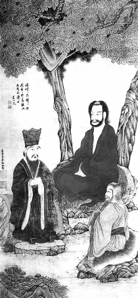 《三教图》。图中描绘了佛、儒、道三教创始者共坐树下相谈的场景,为明代画家丁云鹏的想象之作。该图反映了中国文化对外来文化所秉持的吸收和转化态度。 资料图片