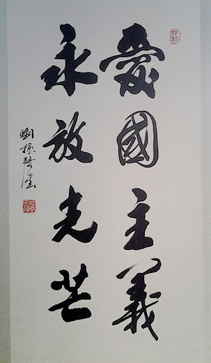 为大力弘扬爱国主义,8月15日上午,八路军老战士文工团在广东省佛山市南海艺谷美术馆主办举行了“纪念中国人民抗日战争暨世界反法西斯战争胜利68周年当代名家爱国书法展”。八路军老战士文工团团长焦歌和佛山市南海区有关方面领导同志参加了开幕仪式。