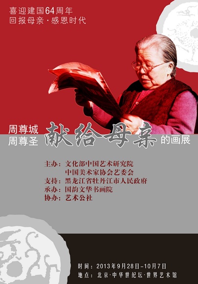 正值中华人民共和国64华诞之际,由中国艺术研究院、中国美术家协会艺术委员会主办;国韵文华书画院承办的《献给母亲——周尊城 周尊圣画展》将于2013年9月28日上午10点在北京中华世纪坛开幕式。