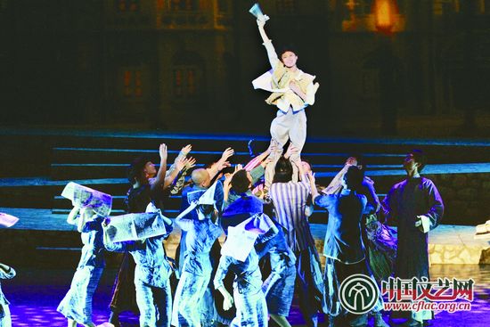 作为一部音乐剧,又是以音乐家聂耳为主角的音乐剧,更是一部以国歌为主题的音乐剧,《国之当歌》在音乐上面对的挑战是可想而知的。聂耳的几十首歌曲挑选哪些呈现于舞台?这些歌曲与国歌在音乐上如何连接?音乐剧必需的原创歌曲和音乐如何与它们有机结合?这些都是无可回避的难题。《国之当歌》在这方面作了审慎而有效的努力。首先,全剧确定以《卖报歌》《码头工人》《铁蹄下的歌女》《毕业歌》《义勇军进行曲》5首歌为主体,它们在音乐风格上虽有不同,但在内涵上有一脉相承的内在贯通。这一挑选应当说是得当的。它们的渐次展示可以水到渠成地将剧情推向高潮,导向国歌的雄壮奏响。与此同时,全剧新创了《呐喊》《醒来吧,雄狮》《血肉长城永不倒》《唱响振奋中华的歌》等30首歌曲,还设计了“激情”与“爱情”两个音乐主题。并通过聂耳的歌曲的变奏、发展,新创歌曲调性、风格等方面与之的协调,加上将《义勇军进行曲》的动机性乐汇作为主题动机,使全剧的音乐融成一个整体,达到了较好的效果。特别是全剧高潮时,聂耳的咏叹调《唱响振奋中华的歌》,长达7分多钟,以波澜起伏的旋律、层次丰富的配乐,将聂耳面对山河破碎,民族危亡内心痛苦与悲愤交加的激奋和怒吼尽情倾泻,从而顺理成章地引出了《义勇军进行曲》的铿锵音符。所以每当戏演到此时,全场观众无不动容,情不自禁地起立,台上台下同声引吭高歌,其情其景极为激动人心。