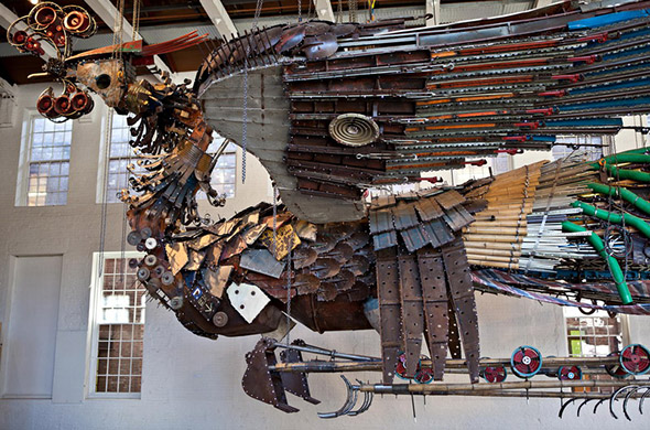 打造《凤凰》的过程充满着曲折,在每个转折点都需要灵活处理。徐冰这样描述“凤”和“凰”的形成:“方法并不复杂,好像扎中国灯笼一样。同时它们也契合着西方现成品组合的概念。创作的整个过程构成了环境和中国社会之间的互动关系。”既冲突激烈又异样美丽,徐冰创作的神鸟见证了当今中国劳动、历史、商业发展和快速财富积累之间复杂的相互关联。